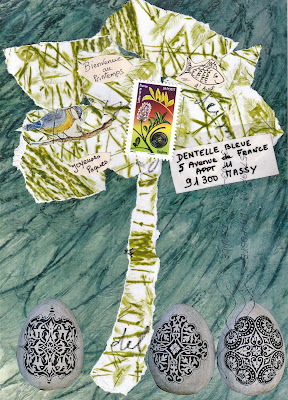 Avec l'arrivée du printemps, et l'imminence de la fête de Pâques, Michèle a choisi de m'envoyer un arbre chargés de symboles, pour exprimer son bonheur de voir la nature reverdir, les oiseaux chanter, et bientôt les oeufs décorés envahir les jardins.
